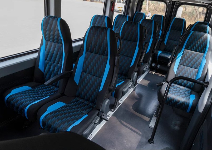 Inside, the Urbania features a spacious and well-designed cabin with high headroom, wide aisle space, and premium-quality seats arranged to accommodate 17 passengers with ease. Large panoramic windows allow for excellent natural lighting and views, enhancing the travel experience for passengers.